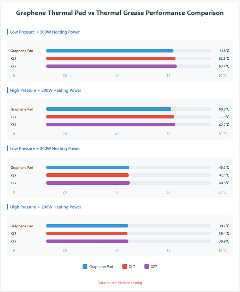 Graphene thermal pads demonstrate superior heat dissipation performance compared to traditional thermal paste under most testing conditions, with particularly significant advantages in high heat generation scenarios. Under high-pressure environments, their performance improvement margin is also greater than thermal paste, proving the potential and value of graphene materials in thermal applications.